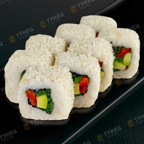 Рис, нори, чука, авокадо, перец сладкий, кунжут.
