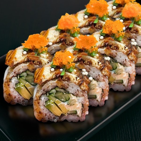 Заказать Рис, нори, сыр сливочный, огурец, авокадо, угорь, чука, тобико оранжевое, рисовые шарики, соус унаги.