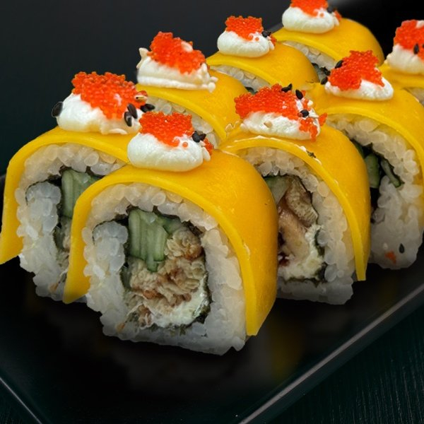 Рис, нори, манго, сыр сливочный, краб микс, лосось, тобико красная.