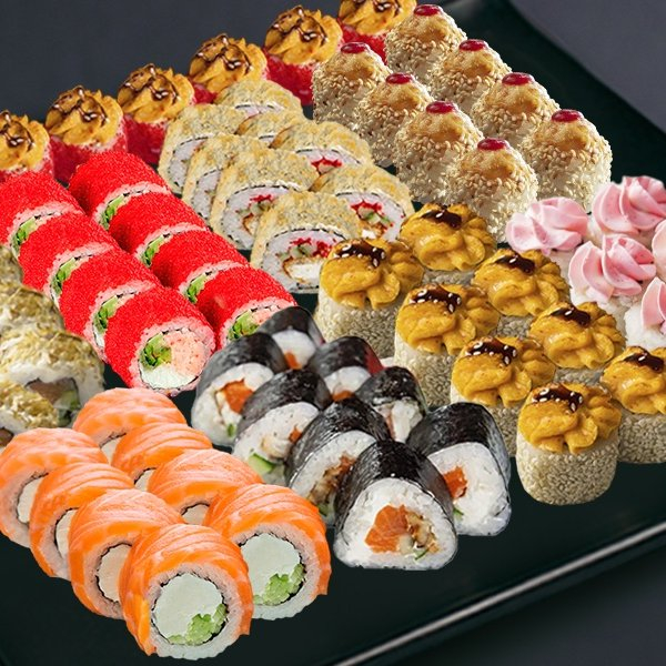 Лава с крабом (рис, водоросли нори, снежный краб, лава соус, творожный сыр), адзума (рис, водоросли нори, филе лосося, соус для запекания, белый кунжут, соус шрирача), тейда (рис, водоросли нори, филе лосося, соус для запекания творожный сыр, красная тобико, унаги соус, белый кунжут), филадельфия классика (рис, водоросли нори, творожный сыр, огурец, филе лосося), канада темпура (рис, водоросли нори, творожный сыр, угорь, огурец, кляр, панировочные сухари, оранжевый тобико), три четверти (рис, водоросли нори, творожный сыр, филе лосося, угорь, огурец, унаги соус, белый кунжут), бонито (рис, водоросли нори, филе лосося, огурец, творожный сыр, стружка бонито), калифорния классика (рис, водоросли нори, творожный сыр, огурец, снежный краб, красная тобико), этна (рис, водоросли нори, творожный сыр, снежный краб, соус для запекания, унаги соус, белый кунжут).