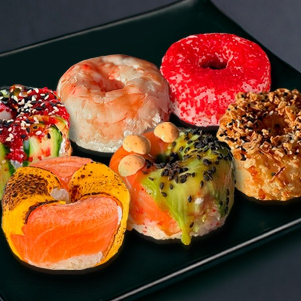 Донат с угрем, донат Лосось в чеддере, донат Креветка, донат Лосось в тобико, донат Лосось с авокадо, донат Креветка темпура.