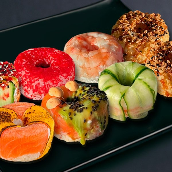Донат с угрем, донат Лосось в чеддере, донат Креветка, донат Лосось в тобико, донат Лосось с авокадо, донат Креветка темпура.