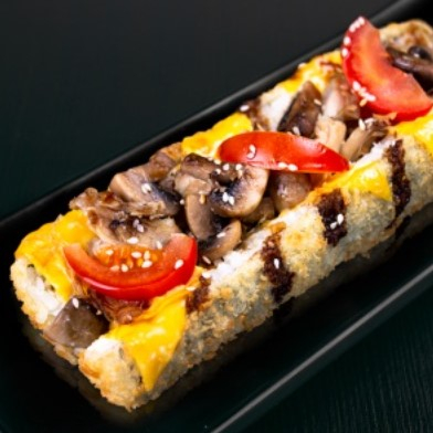 Заказать Рис, нори, шампиньоны, куриное филе, сыр чеддер, сыр сливочный, лук фри, черри, соус терияки, темпура.