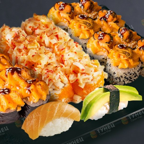 Заказать Гриль лосось, ролл масакура, ролл гриль миди, сяке суши 1 шт (рис, филе лосося), авокадо суши 1 шт (рис, авокадо, водоросли нори).