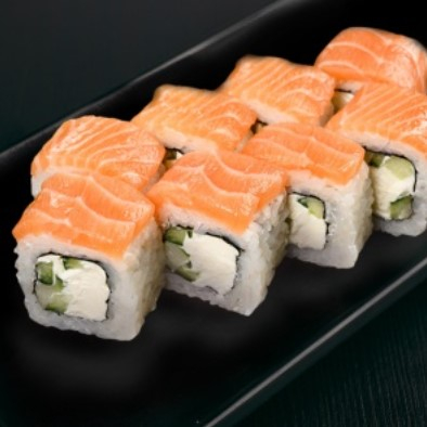 Нори, рис, сыр сливочный, угорь, лосось, огурец, кунжут, соус унаги.