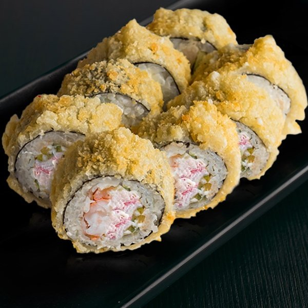 Заказать Рис, нори, креветки, снежный краб, огурец, сливочный сыр, темпур.