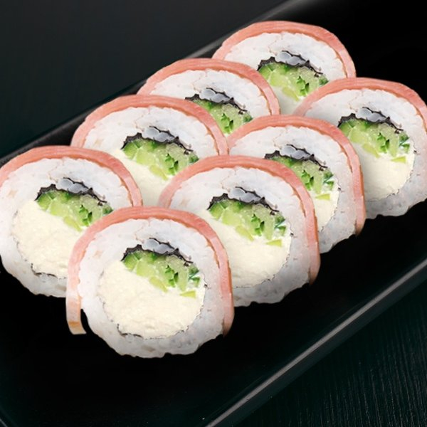 Заказать Рис, нори, бекон, курица, сыр сливочный, майонез, моцарелла, барбекю, лук перо, тобико оранж.
