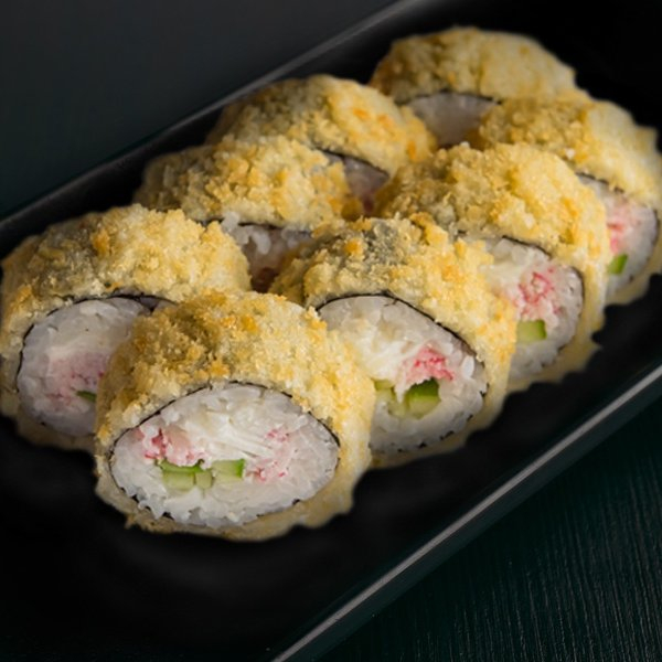 Рис, нори, снежный краб, огурец, сливочный сыр, тобико, темпур.