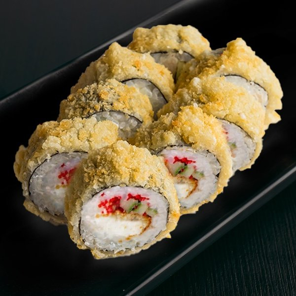 Рис, нори, снежный краб, огурец, сливочный сыр, тобико, темпур.