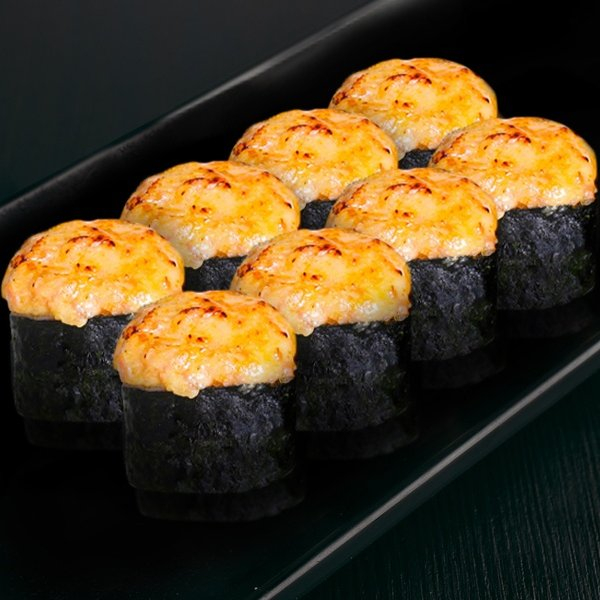 Нори, рис, мидии, тигровые креветки, кунжут, сыр сливочный, огурец, соус унаги, соус для запекания.