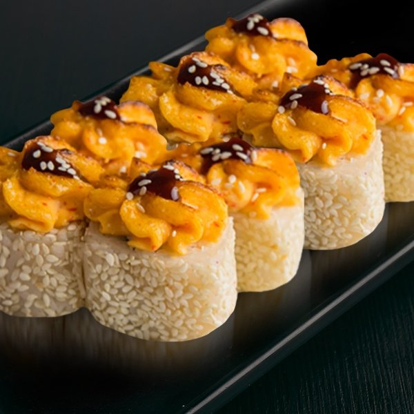 Нори, рис, огурец, сыр сливочный, лосось, соус унаги, кунжут, соус для запекания.