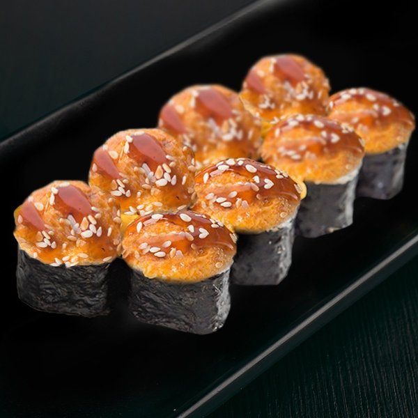 Рис, нори, сыр сливочный, снежный краб, соус для запекания, унаги соус, кунжут.