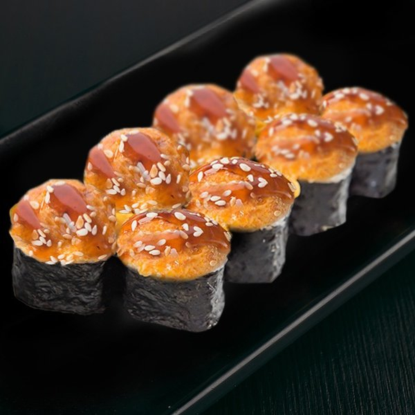 Рис, нори, сыр сливочный, креветки тигровые, соус для запекания, кунжут.