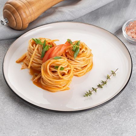 Аль денте спагетти в томатном соусе и рублеными томатами конкассе. Соус на основе томатов в собственном соку, с овощами и свежим базиликом.