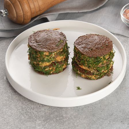 Жареные оладьи из печени цыпленка с начинкой из домашнего майонеза, пассерованного луком и морковью.