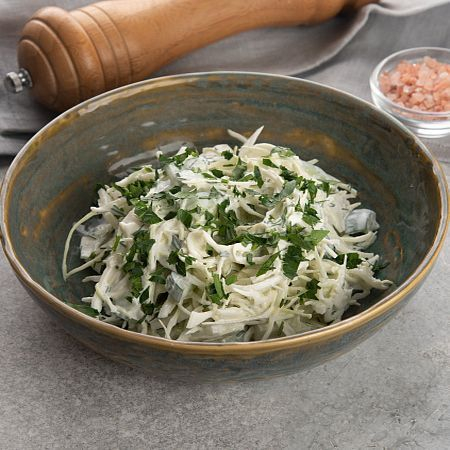 Капуста свежая, редька дайкон, огурец, сметана, майонез, укроп, петрушка.