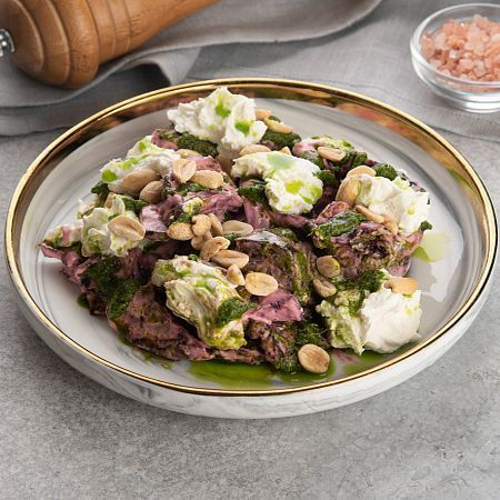 Свекла, майонез, свекольный сок, имбирь, сыр творожный, сыр рассольный, соус песто, зеленое масло, арахис жареный.
