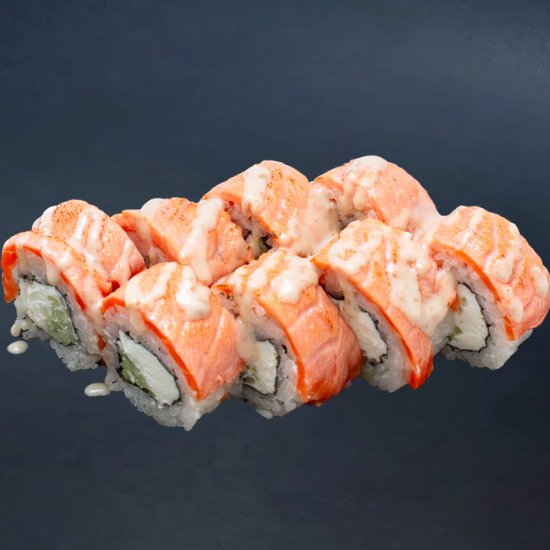 Рис, нори, сыр филадельфия, огурцы, лосось, соус кунжутный.