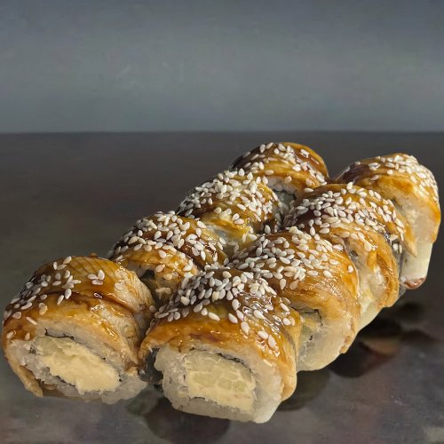 Рис, нори, угорь, сыр филадельфия, огурцы, угорь, унаги, кунжут.