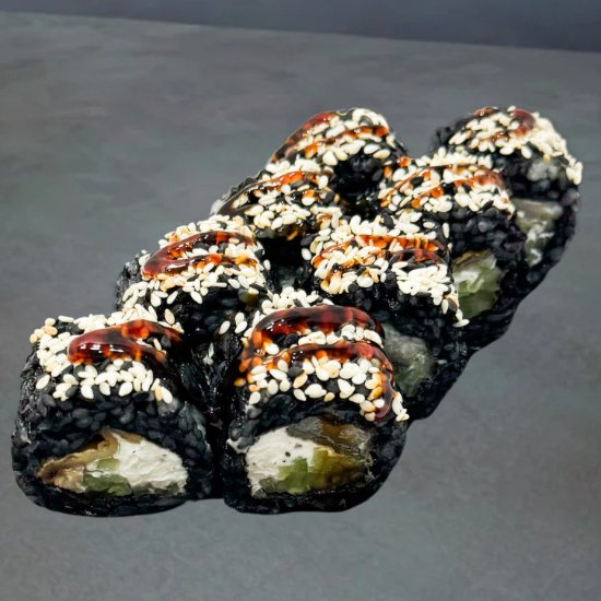 Рис, нори, сыр филадельфия, огурец, угорь, Унаги, кунжут.