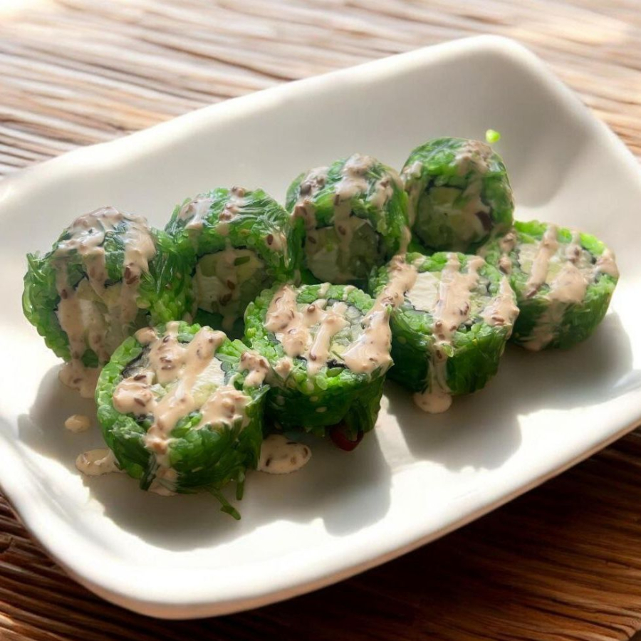 Рис, нори, сыр Филадельфия, огурцы, авокадо, чука, соус кунжутный.
