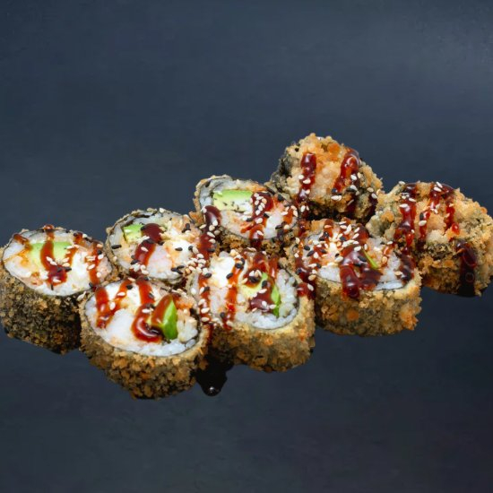Рис, нори, сыр филадельфия, капуста пекинская, курица, соус шрирача, унаги, кунжут, сухари панировочные.
