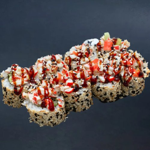 Рис, нори, сыр филадельфия, огурцы, омлет тамаго, крабовая палочка, сладкий чили, кунжут, унаги.