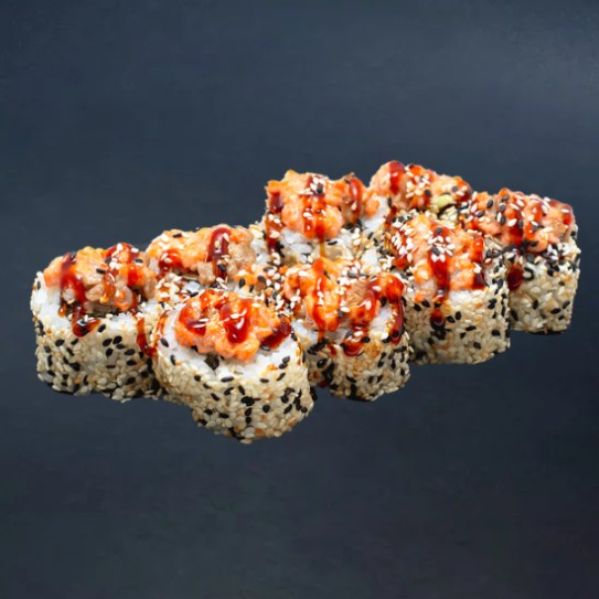 Рис, нори, сыр филадельфия, огурцы, креветки, икра тобико, сырный соус, унаги, кунжут.
