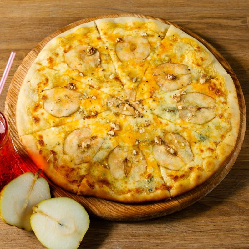 Сырный соус, сыр моцарелла, свежая груша, сыр чеддер, сыр дор блю, мед, грецкий орех.