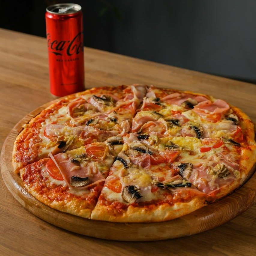 Пицца-соус, чесночный соус, сыр, салями, ветчина, шампиньоны.