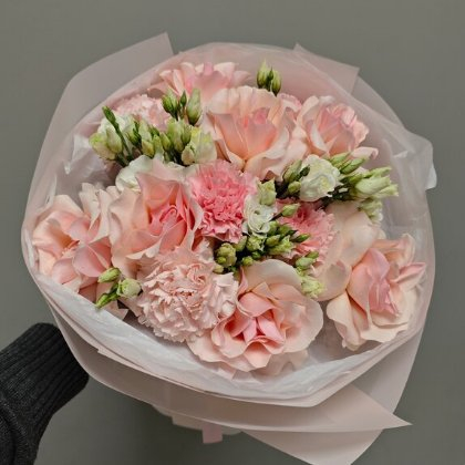 Состав букета: роза французская - 7шт, эустома - 3шт, диантус - 5шт, флористическое оформление.
