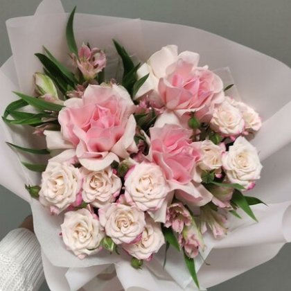 Состав букета: роза кустовая - 2шт, роза французская -3шт, альстромерия - 2шт, флористическое оформление.