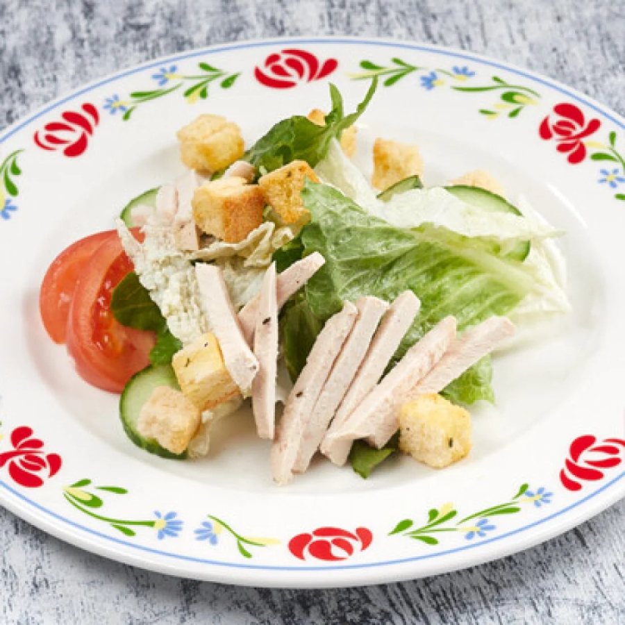 Пекинская капуста, листья салата, куриное филе, огурцы, помидоры, гренки с травами, подаётся с соусом из зелени.
