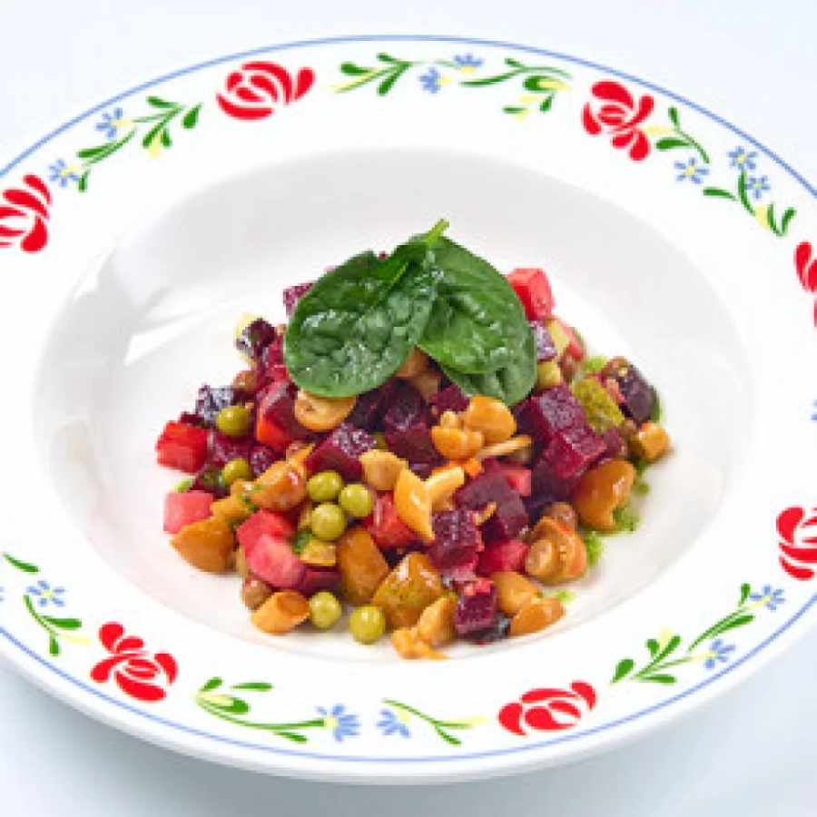 Отварные свекла, картофель и морковь, консервированный горошек, маринованные огурцы, консервированные опята, заправленные масляной заправкой с лимоном, подаётся с соусом из зелени и шпинатом.