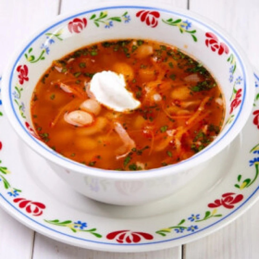 Картофель, морковь, лук, белая фасоль, бекон, томатная паста, чеснок, зелень, подаётся со сметаной.