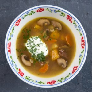 Тыква, говяжьи щеки, перловая крупа, коричневые шампиньоны, картофель, морковь, лук, подается со сметаной и зеленью.