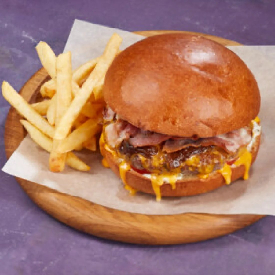Заказать Булочка Бриошь, котлета из говядины, Чеддер, помидоры, соус тартар, соус Барбекю, карамелизированный лук, обжаренный бекон, подается с картофелем фри.