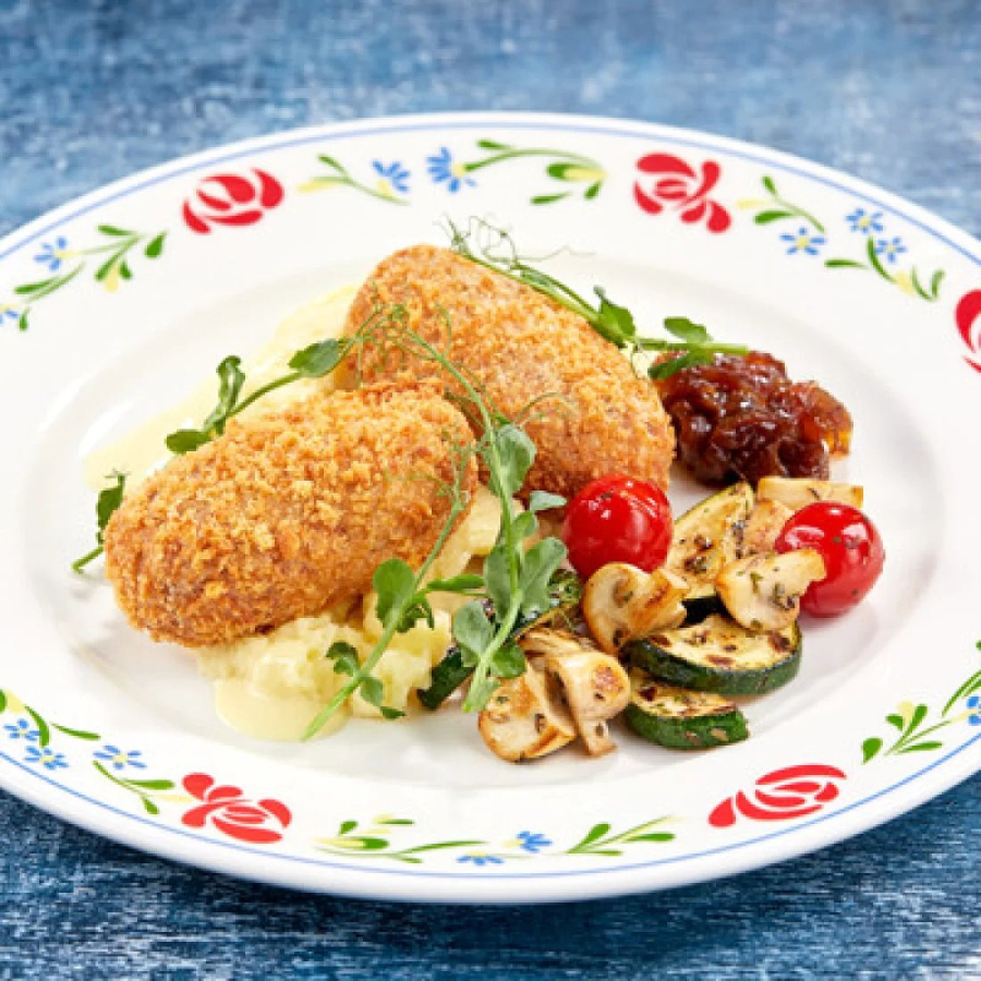 Заказать Котлеты из лосося и крабового мяса, жаренные в хрустящей панировке, подаются с картофельным пюре, обжаренными шампиньонами, цукини и томатами черри, карамелизированным луком, сливочно-горчичным соусом и ростками гороха.