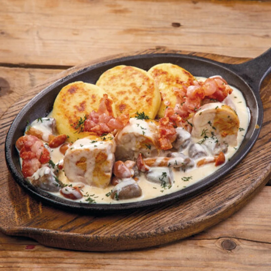 Заказать Бедрышки и сердечки в сливочном соусе с маринованными опятами, подаются с обжаренным беконом и с гарниром: картофельные пирожки 150г.