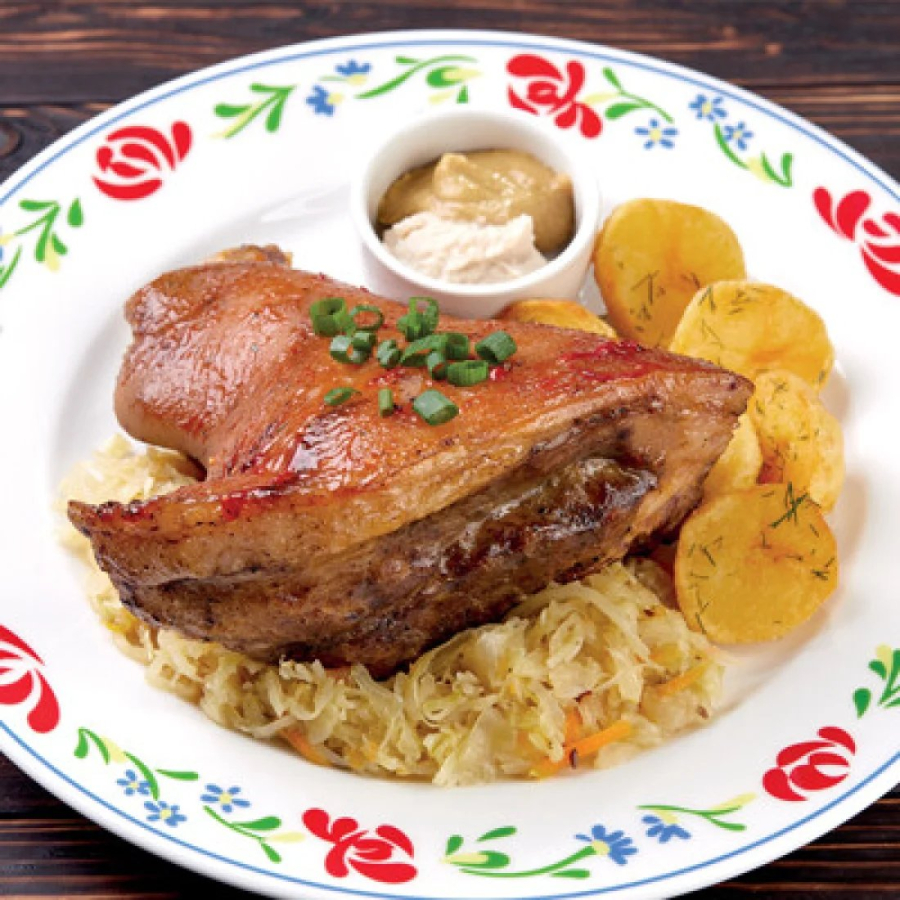 Заказать Запеченная свиная рулька, подается с тушеной капустой, пюре, хреном и горчицей.