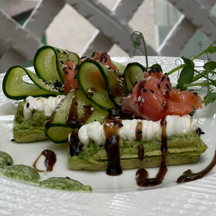 Вафля из шпината, крем-чиз, свежий огурец, с/с лосось. Подается с соусом терияки, кунжутом и зеленью.