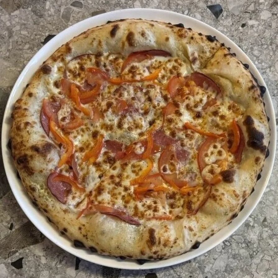 Томатная основа, куриное филе, ветчина, маринованный лук, маринованный огурец, шампиньоны, соус Чесночный, сыр Моцарелла.