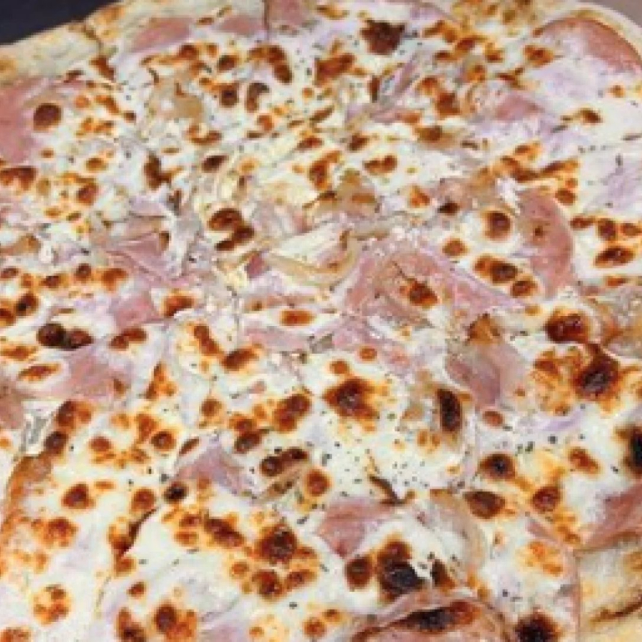 Соус Сливочный, грудинка свиная, сыр Моцарелла, топпинг Сырный пармеджано, ветчина.
