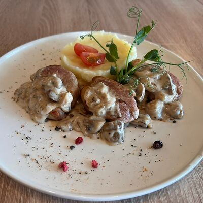 Свиная вырезка, картофельный крем, грибной соус, черри, микрозелень.