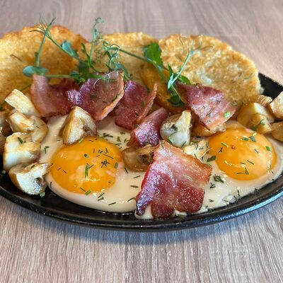 Драники картофельные, яйцо куриное, бекон, грибы, сметана, специи, зелень.