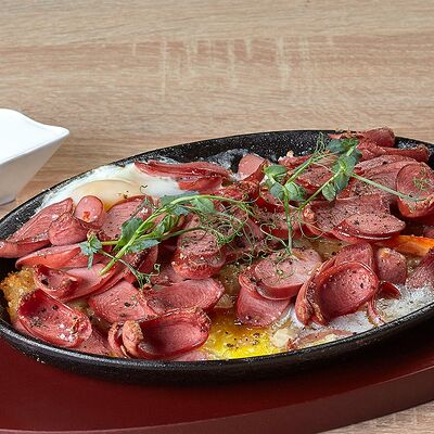 Драники картофельные, колбаски охотничьи, яйцо куриное, сметана, лук, специи, зелень.
