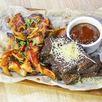 Картофель, говяжья щека, лук, шампиньоны, капуста квашеная.
