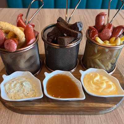 Картофель фри, гренки из ржаного хлеба, луковые кольца, колбаски охотничьи, соус сырный, соус кисло-сладкий, соус тартар.