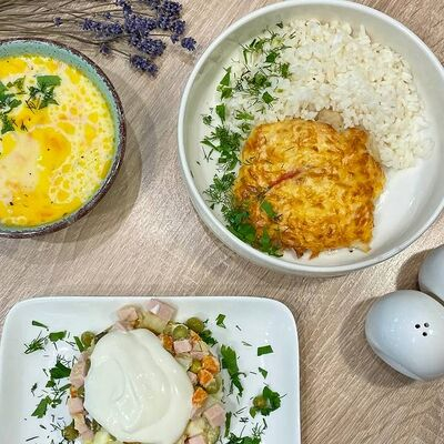 Сырный суп с овощами и ветчиной, рыба запеченная с томатом и сыром (филе хека, помидор, сыр, майонез, специи. Запекается до хрустящей корочки), гарнир на выбор, салат Оливье (картофель, колбаса мортаделлия, морковь, огурец, яйцо, гороx консервированный, лук, сметана или майонез).