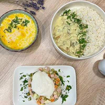 Сырный суп с овощами и ветчиной, курица карри с грибами, гарнир на выбор, салат Оливье.